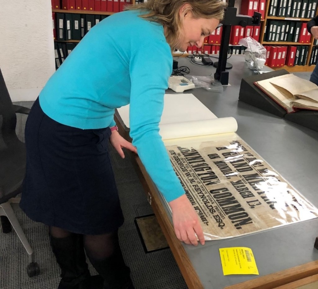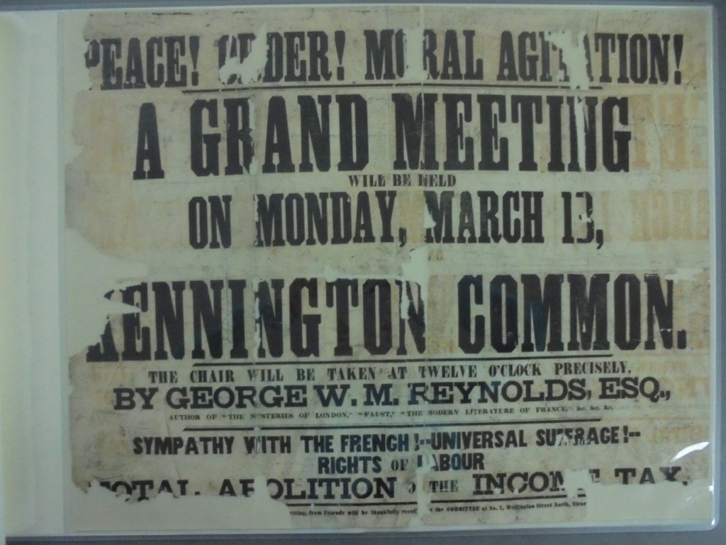 At the end of February 2023 my colleague Mary Shannon and I made a trip to The National Archives (TNA) at Kew, London. There were several overlapping reasons for the visit. Firstly, we were scheduled for a PhD supervision with Mollie Clarke, an employee of the TNA, who is in the final stages of her thesis on Victorian cross-dressing, and who has contributed a chapter on ‘Reynoldsian Women’ to the new collection, G. W. M. Reynolds Reimagined: Studies in Authorship, Radicalism, and Genre 1830-1870 (2023), edited by Mary Shannon and Jennifer Conary. Secondly, a recent catalogue search had revealed several items neither Mary nor I had seen before, including a possible new photograph of Reynolds. Thirdly, I wanted to see a confiscated poster of a London ‘monster’ meeting at which Reynolds spoke in March 1848, shortly after his meteoric ascendancy to the leadership of Chartism. When I first discovered this poster many years ago in a Metropolitan police file, it was in such a fragile state that I persuaded the TNA to restore it. I was given a photocopy of the poster but had not returned to see the original, so for me the trip was both nostalgic and forward-looking: could we make a similar discovery?