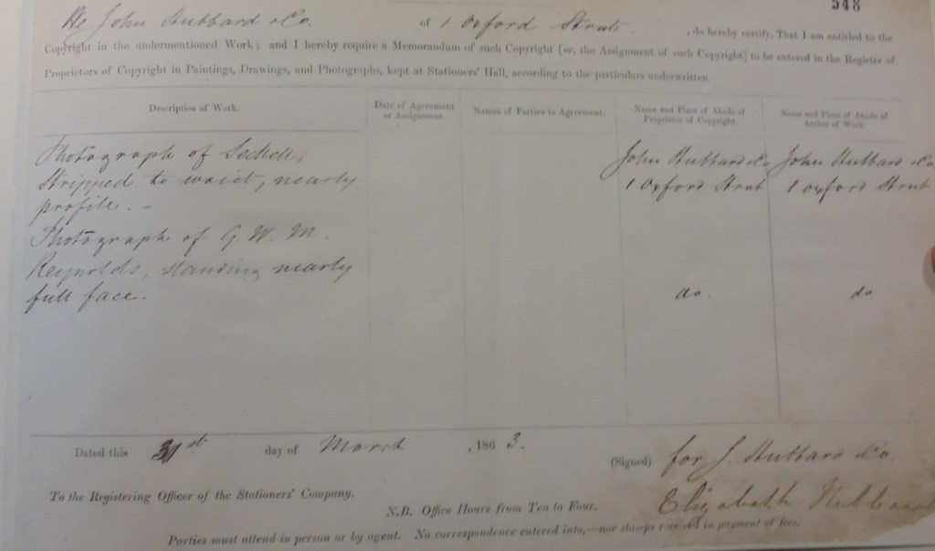 Finally, we come to the new photograph. The National Archives holds the copyright registration documents which Victorian photographers originally submitted to Stationers’ Hall. On 31 March 1863, John Hubbard of Oxford Street registered a photograph of Reynolds ‘standing nearly full face’ (Figure 5). Reynolds may have chosen Hubbard’s studio as it was very close to St Andrew’s Church on Wells Street, a place which Reynolds and his family had already begun to frequent and which, despite its association with social and moral conservatism, would loom larger in Reynolds’s life after he retired. But if Mary and I were hoping to glimpse this more mellow Reynolds ‘nearly full face’ we were sadly disappointed, as the required copy of the photo was missing, and subsequent enquiries to both Stationers’ Hall and the TNA have proved fruitless. What happened to this photograph? Has it been lost forever, or does it languish in a secreted chest along with a trove of Reynolds’s other papers? As we celebrate a new book on Reynolds, the existence of a Reynolds archive remains the greatest ‘mystery’ of all.